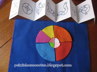As crianças foram desafiadas a construir um jogo para oferecerem ao seu amigo secreto de Natal. Lembrei-me do Tangram circular. Eu fiz este exemplar em feltro, mas as crianças usaram EVA (musgami).
