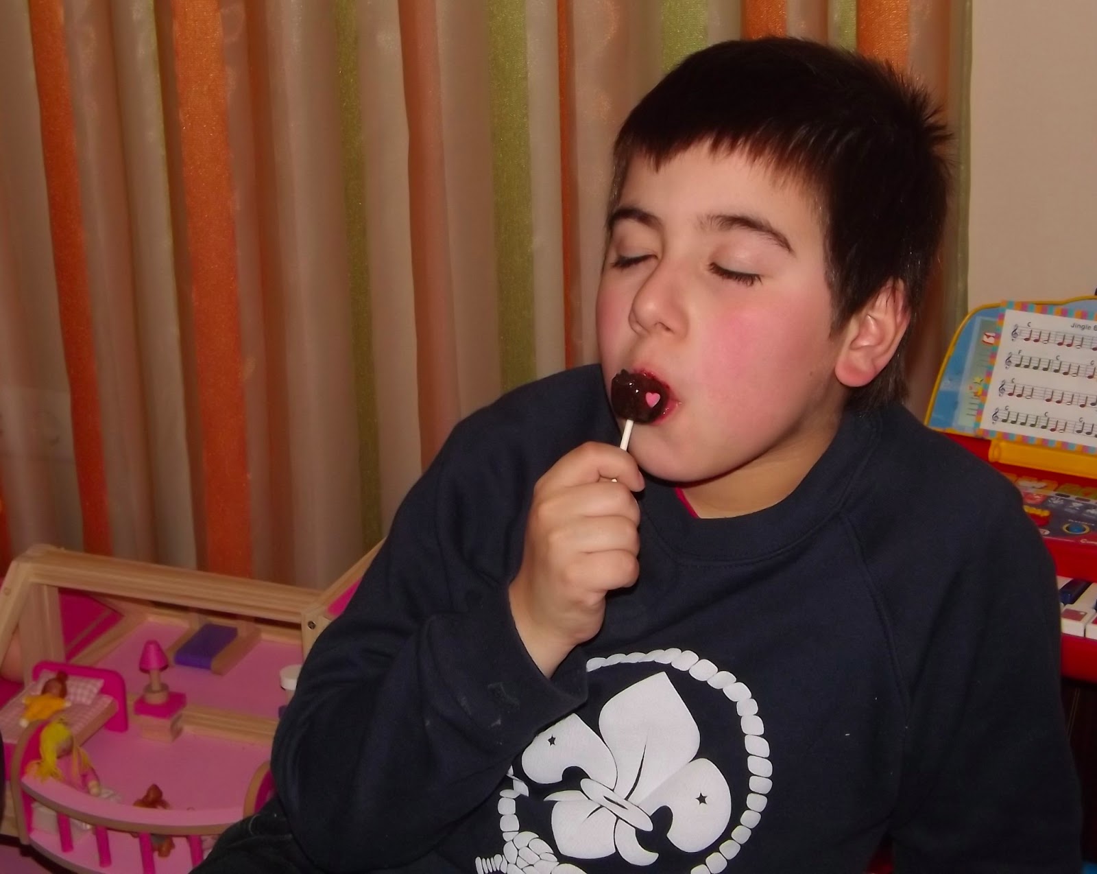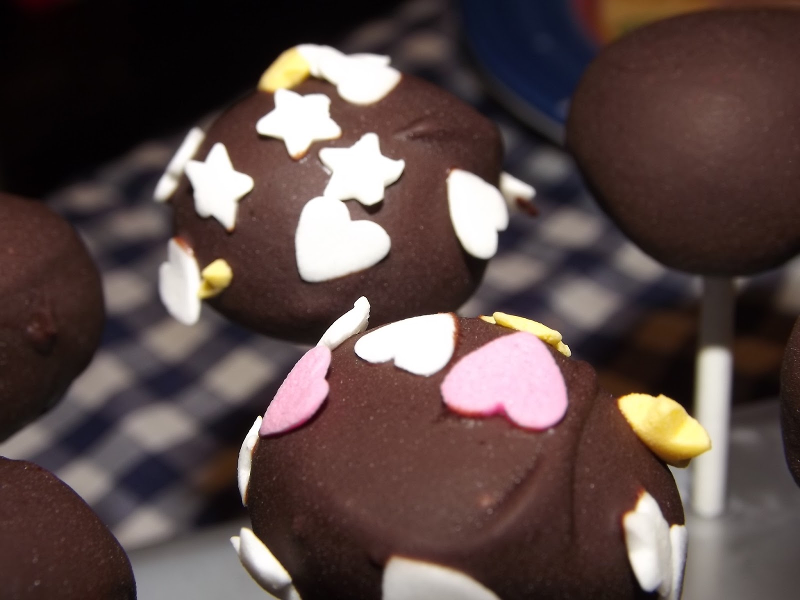 Primeiros cake pops! Ficaram super irregulares pois fi-los à mão, e a decoração ficou a cargo das crianças...